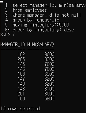 우선 매니저의 사번과 최소급여이기 때문에 select는 위와 같이 설정. employee_id가 곧 manager의 사번이니까.manager_id가 null로 존재하는 행도 있기 때문에 where절은 위와 같이 설정.manager의 밑 사원들은 자신의 행에 해당 manager_id를 갖고 있기 때문에 그룹화는 manager_id로 설정각 매니저의 밑 사원들 중의 봉급이기 때문에, 행 단위가 아닌 그룹단위로 조건을 걸 수 있는 HAVING절을 사용하여 최소값이 5000미만이 되지 않도록 조건을 건다.