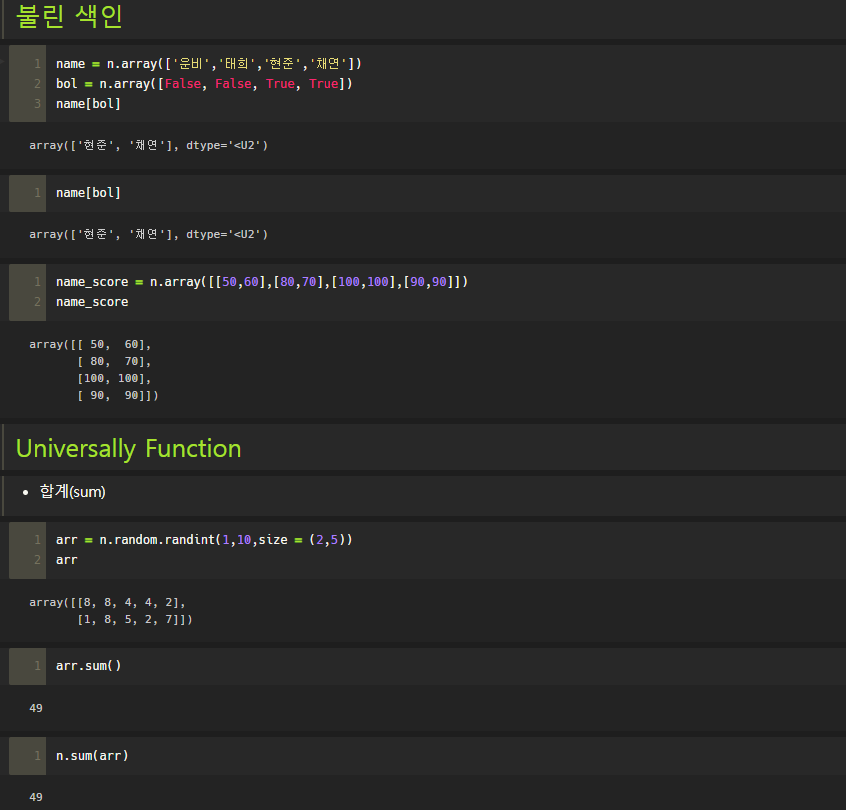 Numpy에서의 불린 색인은 그냥 위 사진 처럼 True인 값에 대한 array 값을 반환하는 것.