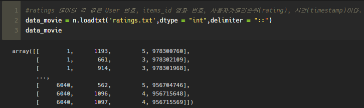 위와 같이 "loadtxt"라는 명령어를 통해 ratings.txt 데이터 파일을 불러와 푸는 문제이다. 불러올 때에 텍스트 파일이 콜론 2개를 사용해 데이터 값을 구분짓기 때문에 "delimiter"를 통해 column을 나눴다.