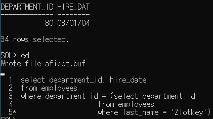 서브쿼리에서 본 것은 last_name의 값이 'Zlotkey'인 부서번호를 반환시켰고, 해당 값을 갖는 사원의 부서번호와 입사 날짜를 출력하였다.