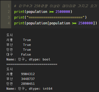 저렇게 Series에 대한 논리기호를 통해 Value값이 Bool 값인 Series로 반환할 수 있으며, 해당 Series를 대괄호로 감싸면 Bool값이 True인 값만 반환하는 Series를 생성할 수 있다.