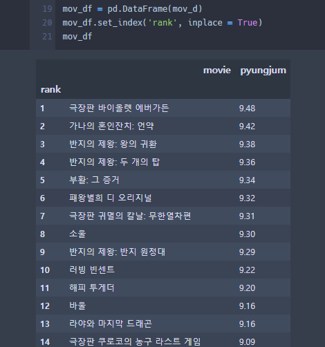 mov_d={'rank':ran_l, 'movie':mov_l, 'pyungjum':pyu_l}