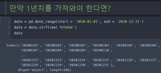 위의 사진을 보면 < date_range(start = 'YYYY-MM-DD', end = 'YYYY-MM-DD') > 명령어로