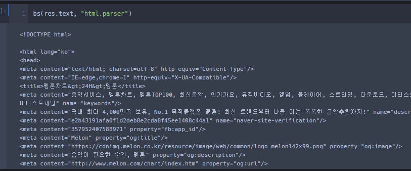 - mo_bs 변수에 가져온 응답코드를 text로 변환, html.parser 통해 정리된 문자로 변환