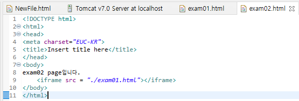 iframe이라는 Tag를 사용해서 같이 붙혀주었다. 02파일에서 01페이지의 위치를 기입하고 exam02.html파일을 실행시키면 아래와 같은 결과를 본다.