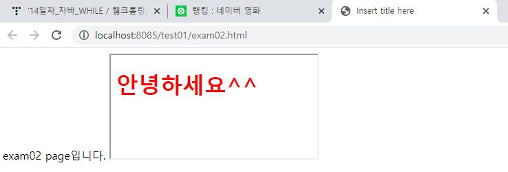 위와 같이 같단한 페이지를 만들었다. exam01이라는 안녕하세요가 출력되는 페이지를 exam02라는 페이지에서