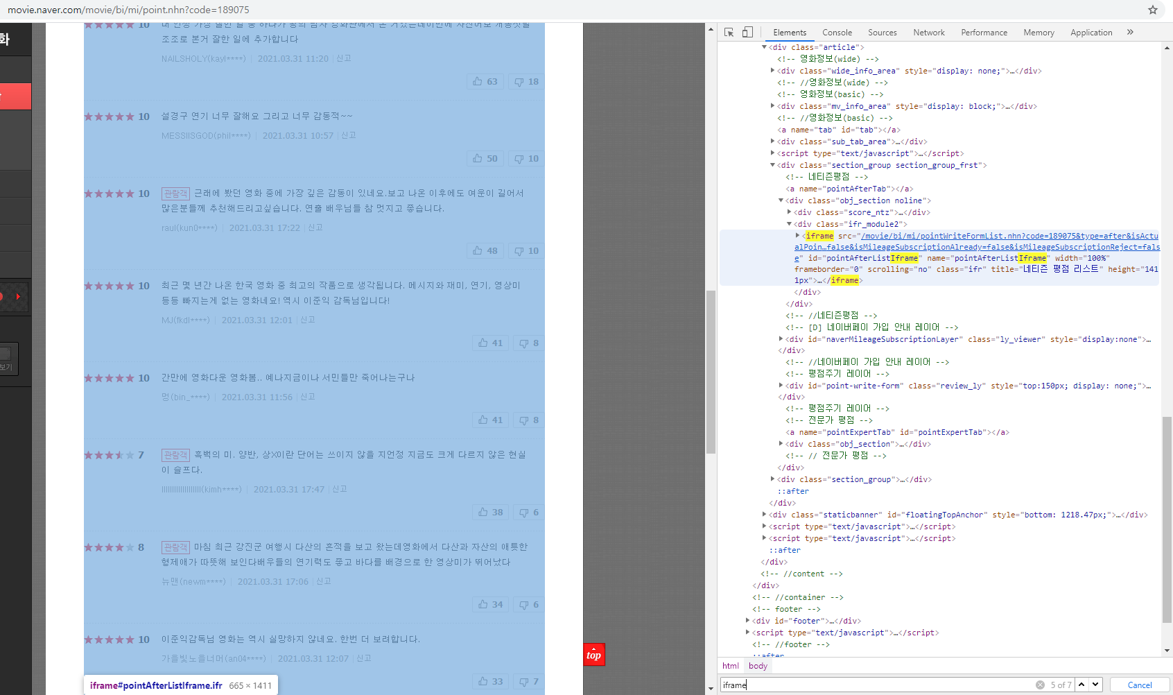 저렇게 리뷰란을 모두 감싸는 iframe Tag를 찾아 해당 주소(src)를 네이버 영화의 원주소 뒤에 복붙한다.