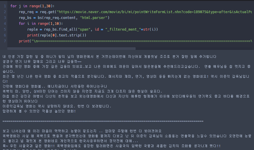 rep_req = req.get("https://movie.naver.com/movie/bi/mi/pointWriteFormList.nhn?code=189075&type=after&isActualPointWriteExecute=false&isMileageSubscriptionAlready=false&isMileageSubscriptionReject=false&page="+str(j))