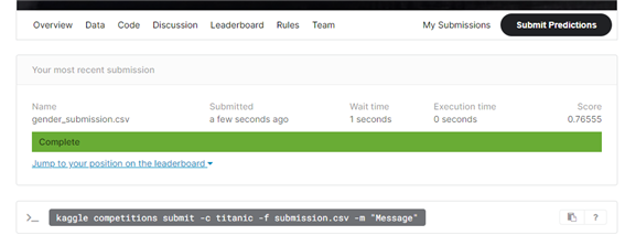 Kaggle에 로그인 하고 내가 만든 결과물을 제출할 수 있다. gender_mission파일에서 Survived의 경우 단순하게 남자면 죽고 여자는 살았다고 가정하고 제출하면 다음과 같은 결과의 정확도가 나온다.