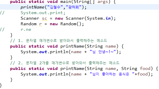 위와 같이 printName이란 동일한 이름을 갖는 Method에 매겨변수의 갯수만 다르게 하여 Method를 2개 생성하였다.