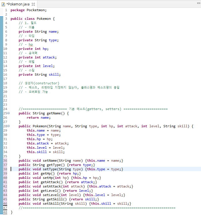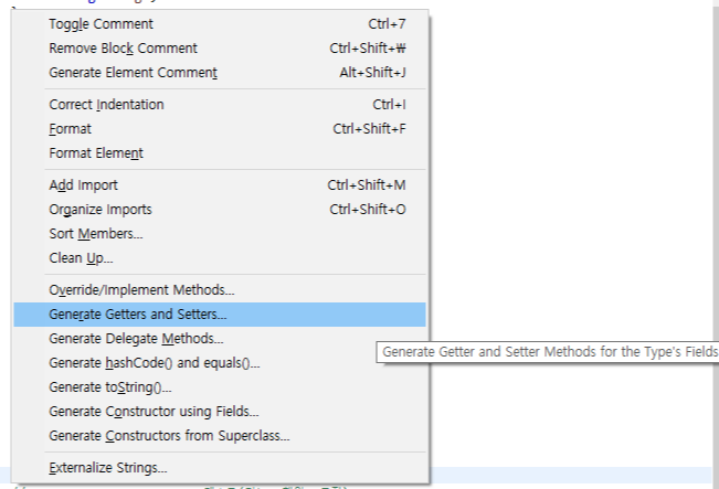 만일 아래와 같은 Class를 생성했다고 할 때, 각 변수들을 리턴해주거나 설정하는 명령어들을 한번에 만들어주는 이클립스 기능이 존재한다.