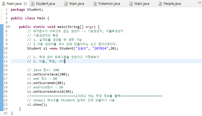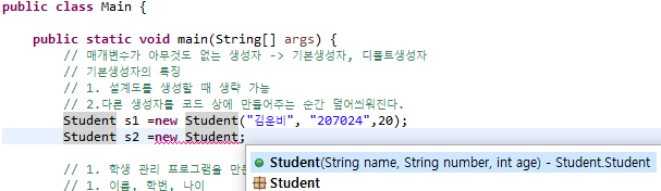사진을 보면 알 수 있듯, 그냥 s1이란 변수에 Student Class를 호출할 수도 있지만, 2번째 처럼 특정 값을 집어 넣어 Data를 Set하도록 하는 Method를 "생성자" 라고 한다.