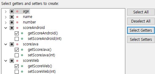 Alt + Shift + S 단축키를 통해 Generate Getters and Setters라는 옵션을 선택하고 아래와 같이 만들고자 하는 Method를 선택하여 생성하면 한번에 만들 수 있다.