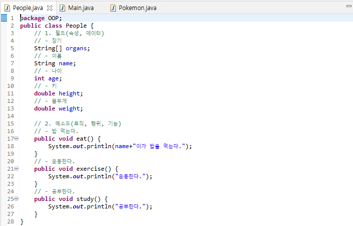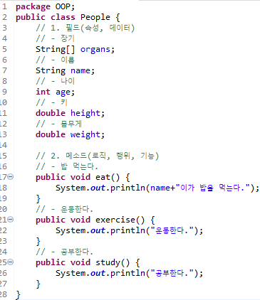 People이란 Class를 만들어 보려한다. 사람이 갖고있는 정보(Field)와 기능(Method or Logic)을 구현한다.