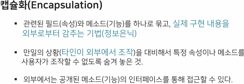 ==> 만든 Data, Logic 등을 하나로 묶어 관리하는 것. / 정보를 은닉하는 것.