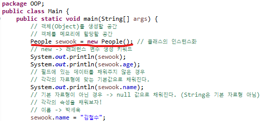 이렇게 만든 People이란 클래스를 사용하려면 아래와 같이 특정 변수에 선언한다. Scanner와 같은 기능을 사용하는것과 같다.