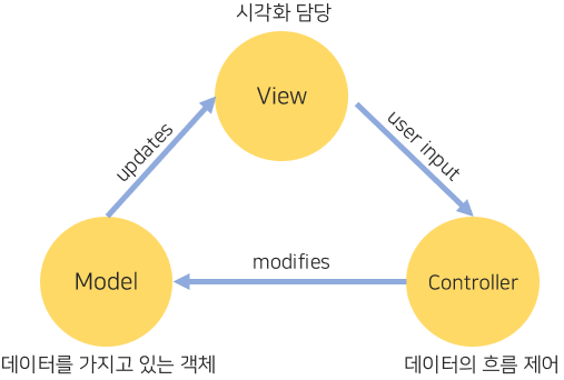 - Controller는 위의 2개를 관리, 제어한다. 오직 Model과 View만을 이용하여, 일련의 과정들이 정상적으로 처리되도 록 순서적인 로직이 구현된 것을 Controller라고 한다.