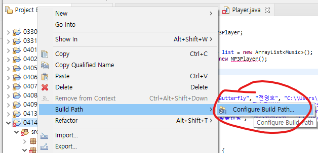 내가 사용할 프로젝트 폴더에서 우클릭을 통해 오른쪽의 사진 처럼 Configure Build Path라는 옵션으로 들어간다.