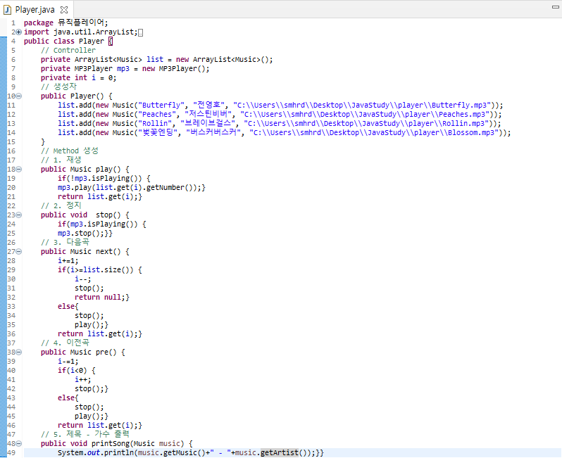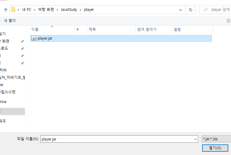 그 다음부터는 Player.jar 라는 파일의 내부에 있는 MP3Player 라는 Class 파일을 이용하여 음악을 들으면 된다.