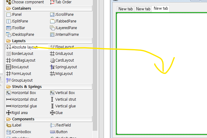 그러나, Absolute/Spring Layout 등의(내가 모르는게 또 있겠지..) Layout옵션을 통해 자유롭게 원하는 구역에 넣을 수 있다.
