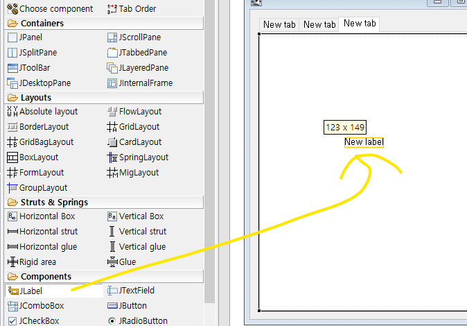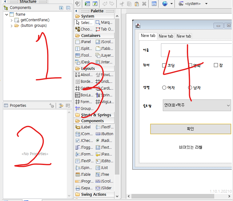 1번은 Components 로 GUI내에 만든 모든 옵션들이 마치 파일과 같이 정리되어 있다. 단어 그대로 구성요소.2번은 Properties 로 선택된 특정 부분(Button,Label etc...)에 대한 정보를 담고 있으며, 수정 또한 가능하다.3번은 Palette 라는 메뉴로써 내가 추가하고자 하는 GUI 기능을 선택하여 삽입할 수 있다.4번은 특별한 명칭은 안보인다만.... 내가 선택하고, 혹은 작성한 코드에 따른 GUI의 대략적 모습을 보인다.