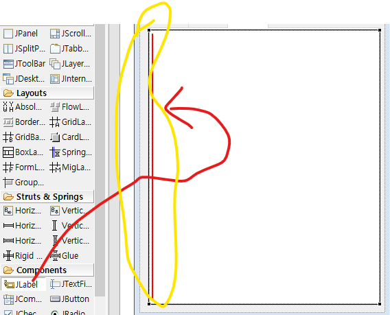 만일 Label을 하나 GUI에 추가한다고 하자, 원래는 아래의 왼쪽 사진 처럼 내가 원하는 구역이 아닌 특정 구역에 한정되어 넣게 되어있다.