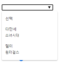 - datalist 와 다르게 타이핑이 아닌 목록 중 선택하게 요구하는 Tag이다.