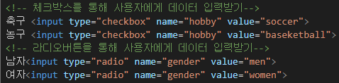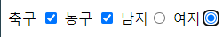 농구<input type="checkbox" name="hobby" value="baseketball">