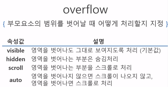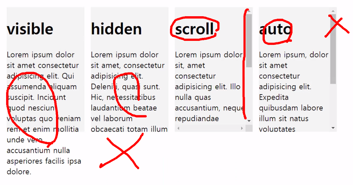 - 위 쪽에 보면 "overflow"라는 기능에 대해 넣을 수 있는 옵션이 4가지 있는데, 이에 대해 사진으로 설명하면