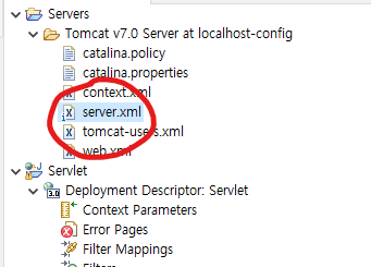 우선적으로 Servlet 프로젝트가 아닌 내가 Server를 생성한 Servers라는 폴더에서 server.xml을 찾아간다.