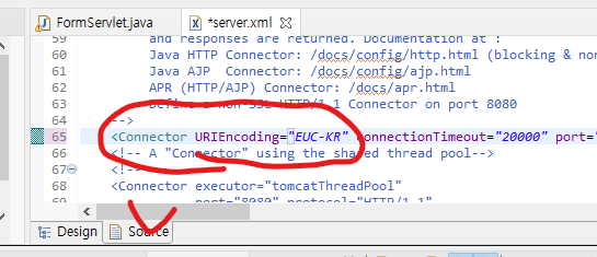 그리고 HTML 파일의 Encoding 방식을 그대로 Connector란 부분을 찾아가 URIEncoding이란 옵션에 값을 추가한다.