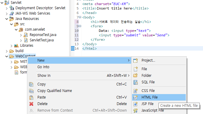 - 파일을 생성한다. HTML 파일을 만들건데, 이번에는 Java Resources가 아닌 Web Content에