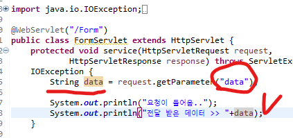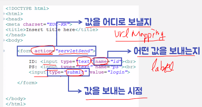 우리는 <form> 태그를 배웠다. 그리고 "action"이란 옵션을 통해 원하는 파일에 데이터를 전송할 수 있었는데, Servlet을 사용할 때에는 URL Mapping 값을 파일 명이라 생각하고 진행하면 된다.