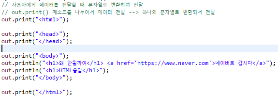 위에서 작성한 HTML 태그를 보면 알 수 있을텐데, println을 쓰던 뭘 쓰던 결국은 한줄로 한번에 데이터 전달을 진행하고 있다. 이데 대해서는.. 그냥 나눠서 쓰면 된다. 예로 들자면
