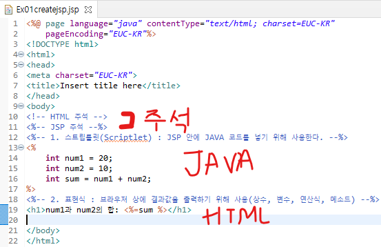 위와 같이 일반적인 표현식으로 작성하면 "<%---%>"와 같은 형태를 띄게 된다. 이때에 변수를 선언하게 되면