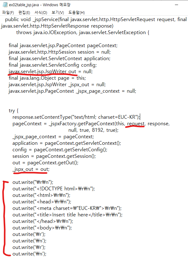 "request.out"이 정의되어 HTML코드를 작성함을 볼 수 있다.