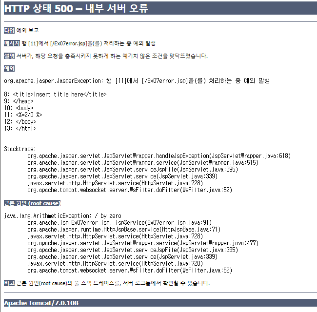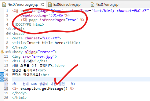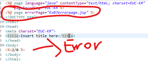 ErrorPage 지시자는 위와 같이, 에러가 발생한 경우 나타나는 페이지를 설정할 수 있다.