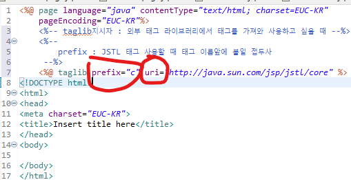 - prefix : 위의 경우에서는 JSTL 태그 사용할 때 태그 이름앞에 붙일 접두사 이다.