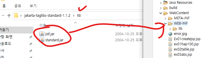 위와 같이 "lib"폴더에 들어가 우리가 사용하던 프로젝트 파일 내의 "WEB-INF" 폴더 안의 "lib"폴더에