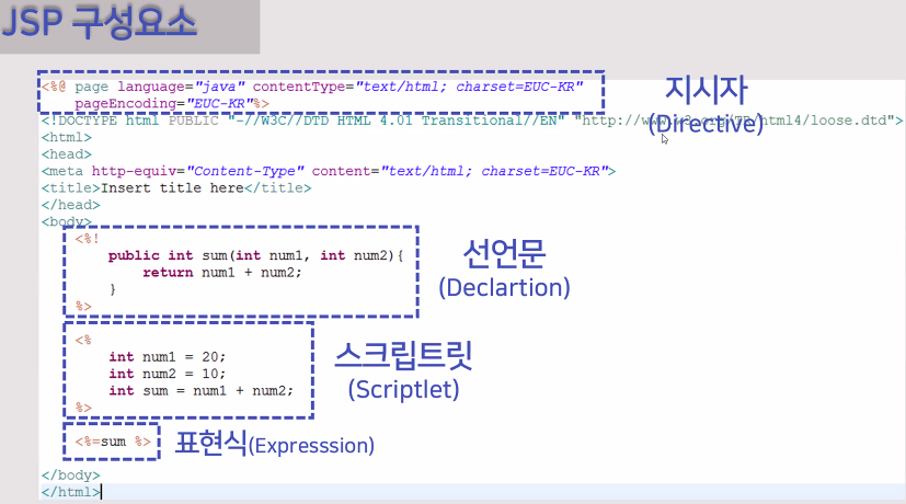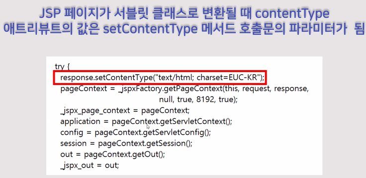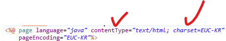 - pageEncoding : JSP 페이지 자체(소스코드 자체)의 인코딩 방식 지정