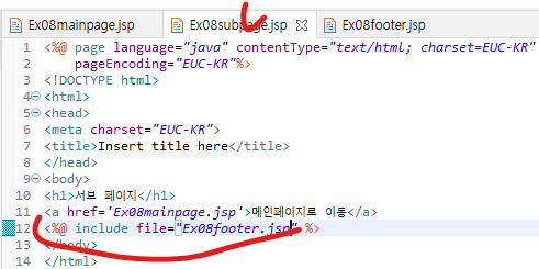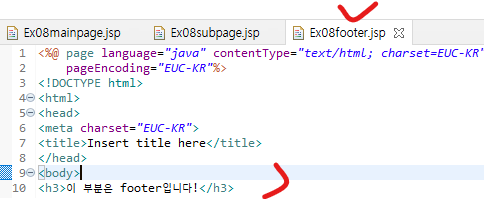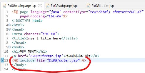 위 사진을 보면 알겠지만 "Ex08footer.jsp"라는 별개의 페이지가 Main페이지와 Sub페이지의 하단에