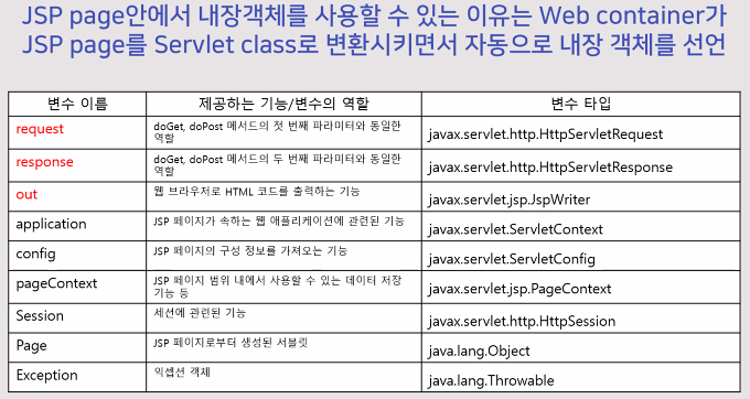 - JSP가 Servlet으로 변환되면서 생성되는 객체들이 있다.