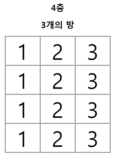 - "lay"와 "room"이라는 변수에 층과 방에 대한 값을 저장하였다. - 반복문을 통해 방을 생성하는 작업을 수행하였다. - i 는 층의 갯수를 (행수), j 는 방의 수를 (열수) 기반으로 반복하였다.