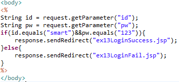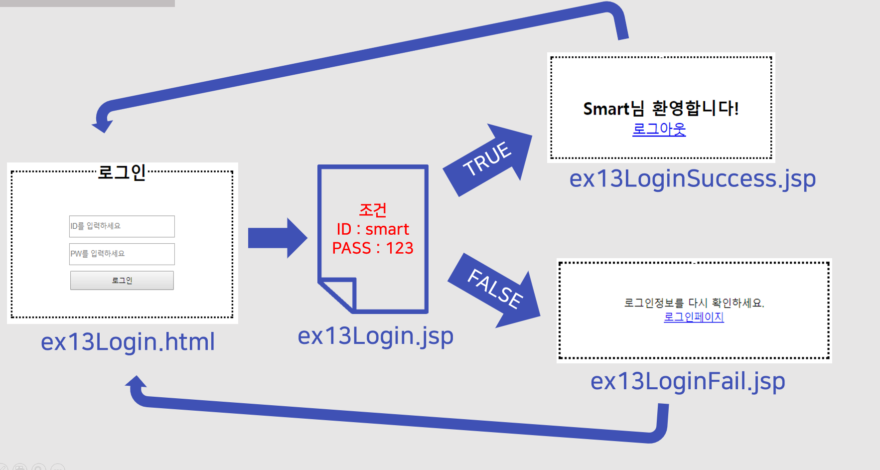 - 로그인 페이지에서 로그인 작업이 수행된다. - response.sendRedirect 명령어를 통해 2가지 경우에 따라 이동하는 페이지를 달리한다. - 우선 ID와 PW는 우선 고정적으로 한개만 있다. - 로그인에 성공하면 환영 메세지를, 실패하면 정보를 확인하라는 메세지를 노출시킨다. - 결국 만들어야하는 파일은 총 4개 .