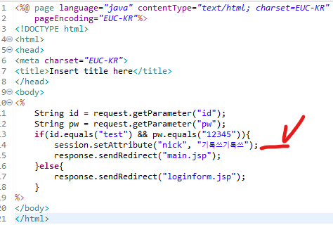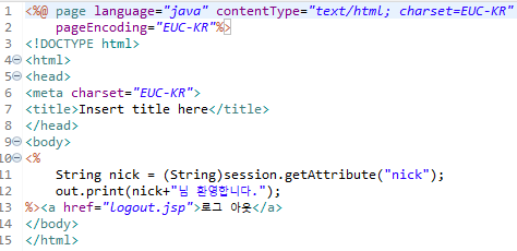 - "logcheck.jsp" 파일에서 저장한 Session인 "nick"을 불러온다 .