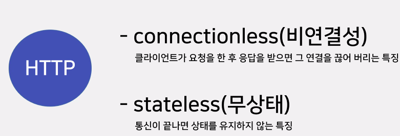 - 비연결성 : 사진 설명대로, Client가 Server에게 요청을 보내고 Server가 응답을 반환하면 연결을 끊는다.