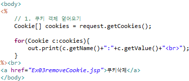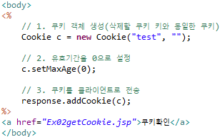 - "setCookie" 파일 부분에서 설명했듯, setMaxAge( ) 함수에 0을 주면 해당 쿠키를 삭제할 수 있다.