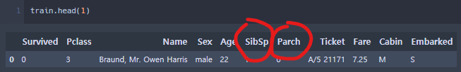 - "SibSp"는 형제 자매의 수 , "Parch"는 부모자식 수 를 의미한다.