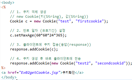 - Cookie 객체인 변수 c 를 생성, 키 값이 "test" 이고 값은 "firstcookie" 라 지정