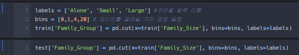 - "Family_Size" 열의 값이 1이면 "Alone" , 2~4명은 "Small" , 5명 이상이면 "Large" 로 변경